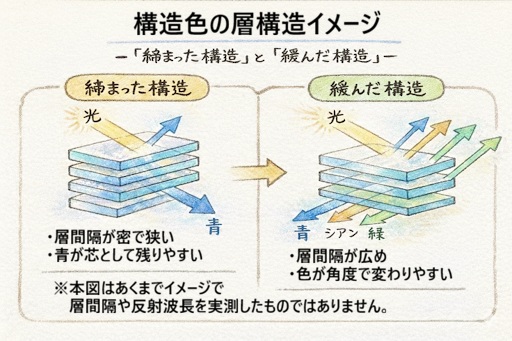※この図は観察結果と参考文献を踏まえた模式的なイメージであり、層間隔や反射波長を実測したものではありません。
