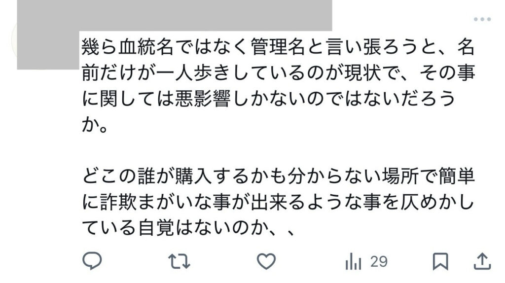 さらに、「2、3年回しただけで、人様のものを少し変えて名前を付けている」といった見方もありました。