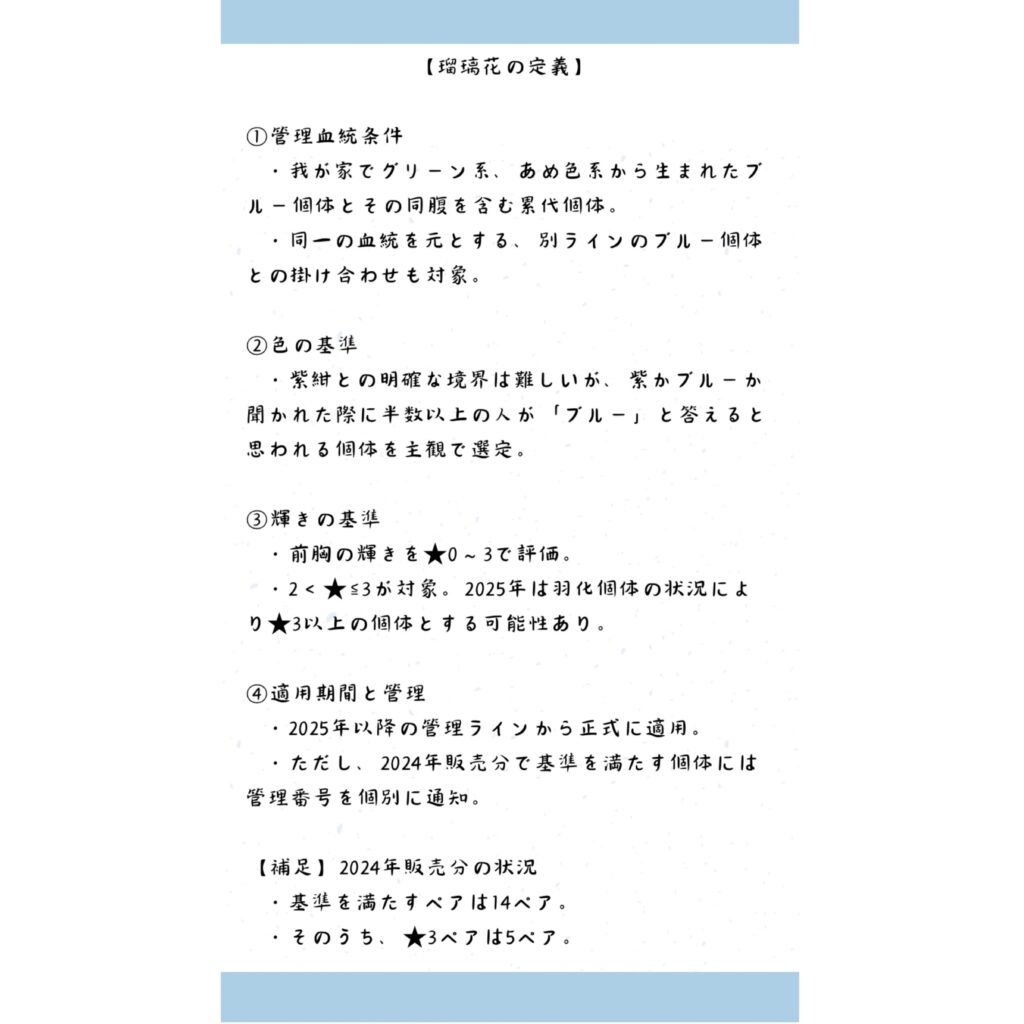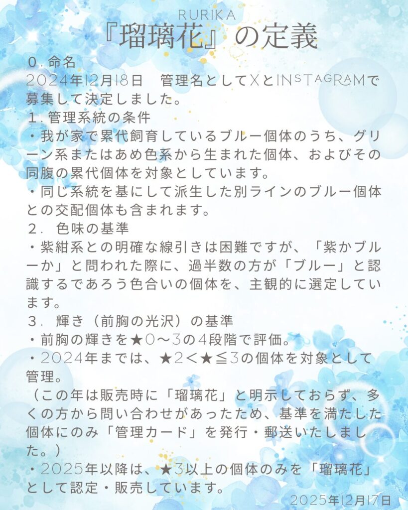 一方で、私は「瑠璃花」について、どのような基準で選別しているのか、また血筋すべてを指す名称ではなく、選抜個体に対する管理名であることを、定義として公に示してきました。