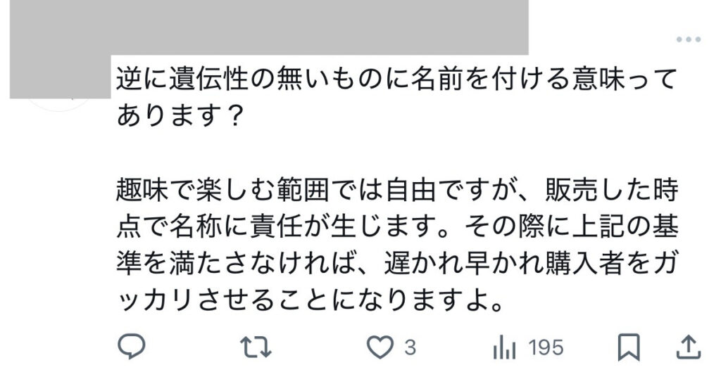 なお、こうした指摘は、たとえば選別前の幼虫の段階で名称を付して販売する場合など、受け取り方によっては誤解を生み得るケースが想定されるとも考えられます。