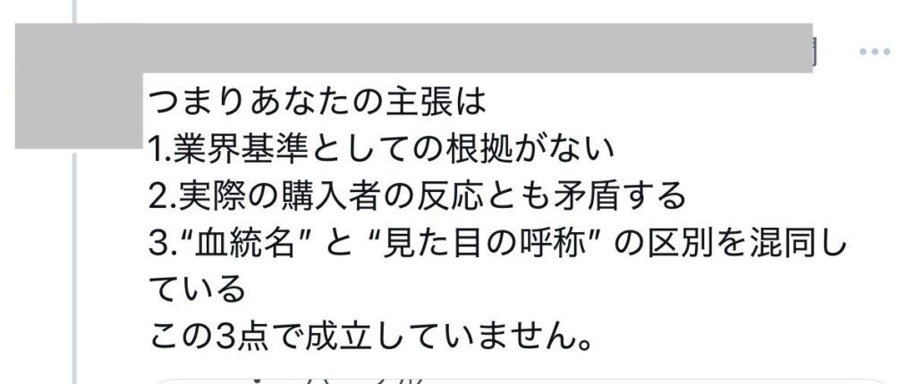 中には、管理名であることが明示されないまま血統名のように扱われ、定義も曖昧な状態で流通しているように見える例もあります。