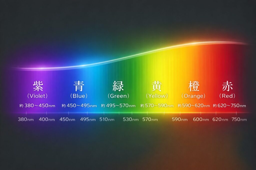 可視光はおよそ380nm〜780nmの範囲にあり、その中で一般的には次のように語られることが多いです。