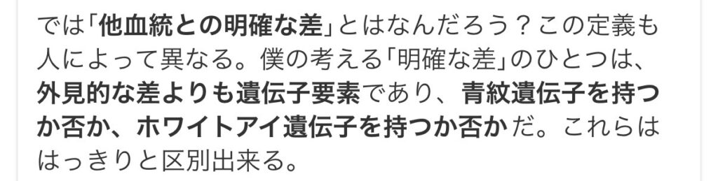 また、他血統との違いについても、外見的な差より遺伝子要素(青紺遺伝子やホワイトアイ遺伝子の有無)を重視する立場があります。