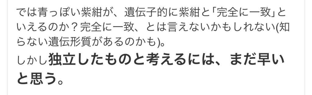 たとえば、青っぽく見える個体であっても、それは独立した「ブルー」ではなく、あくまで紫紺の延長や移行段階として理解すべきだ、という説明です。
